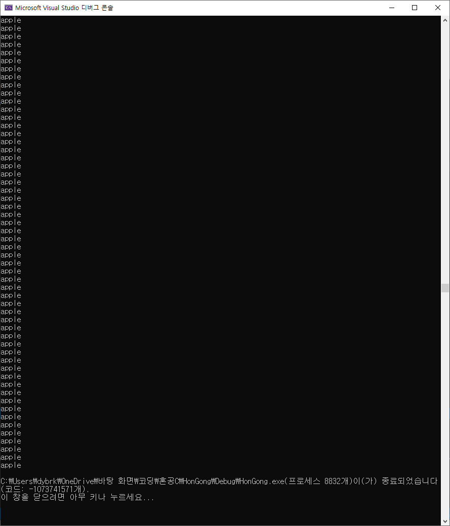 4주차 선택 미션: p.198 7-5. 직접해보는 손코딩 예제 테스트 후 apple 출력 후 종료 인증샷, 왜 무한으로 출력되지 않는지 사유 적기