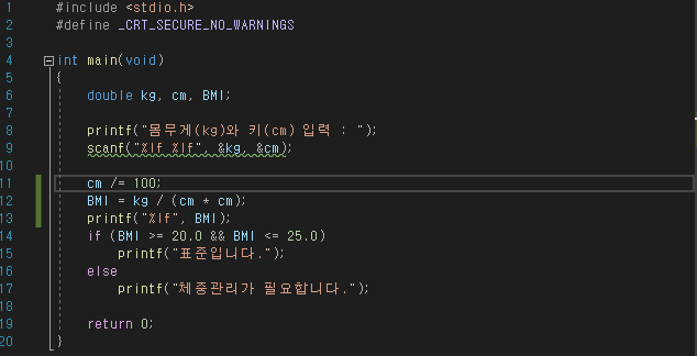 9) scanf를 이용하여 kg과 cm를 받아준다.