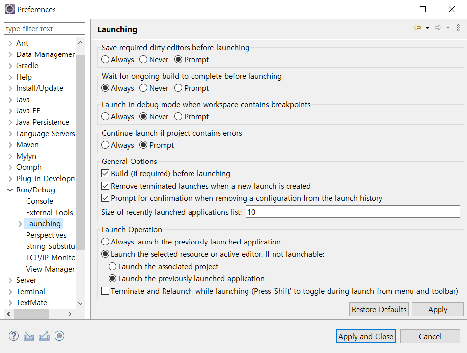 Run/Debug를 선택한 뒤, 3번째 항목인 Launching을 선택하여 준다. 이 창에서 Launch Operation을 확인해 준다.